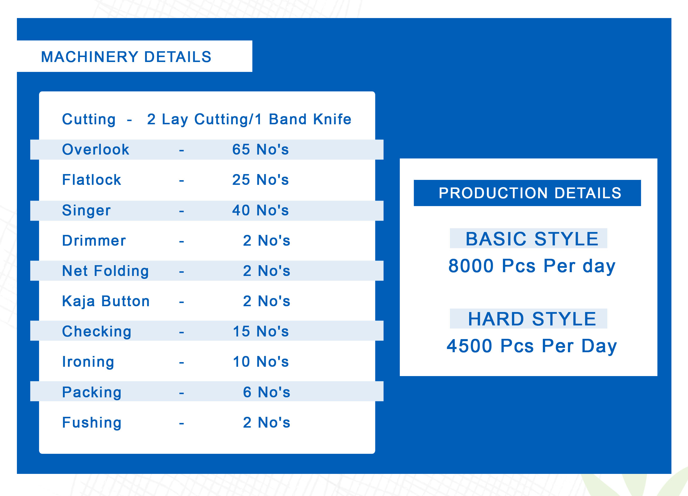 PS Faashion is equipped with modern and well-maintained garment manufacturing machinery to ensure precision, quality, and productivity at every stage of production. Our facility includes high-speed cutting machines, advanced sewing machines, computerized embroidery units, and efficient finishing equipment. Supported by quality inspection and packing systems, our machinery enables consistent output, superior workmanship, and timely delivery while meeting international export standards.
